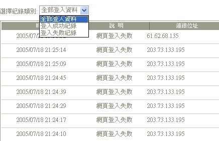 您可藉由信箱登入紀錄查看您以前的登入紀錄,若發現有不常使用的 IP 登入紀錄,或是大量的登入失敗紀錄,都顯示您的帳號可能已遭人盜用或嘗試入侵,此時您就必須趕緊更換您的密碼,以保障您信箱的安全。