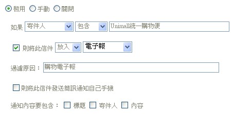 3. 設定編輯完成後選取〔確定〕按鈕,即完成信件過濾規則的新增。 |