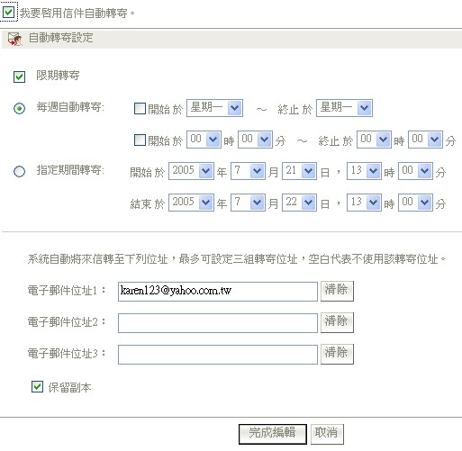 若欲停止「自動轉寄」功能,請將〔我要啟用信件自動轉寄〕選項取消即可。