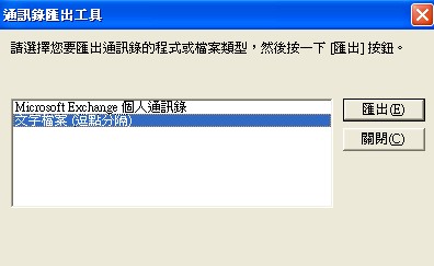 於跳出的 通訊錄匯出工具 視窗中,點選〔文字檔 (逗點分隔值)〕 之後,再按下 〔匯出〕 按鈕。