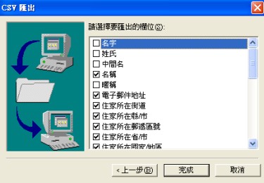 輸入這個匯出檔的檔名,按 [下一步] 的按鈕之後,在請選擇要匯出的欄位中,請勾選全部的項目,按下〔完成〕之後即可匯出通訊錄紀錄檔。