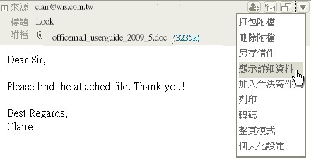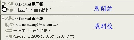 使用者在檢視任何一封信件時,都可以看到信件標題的左側有一正字號圖示,用滑鼠左鍵點一下 就會展開完整的來信資訊: