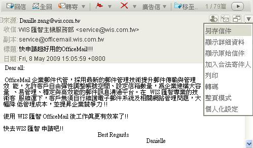 使用者在閱覽信件時,若需要另外將該封郵件儲存下來,您可以點選「工具」→「