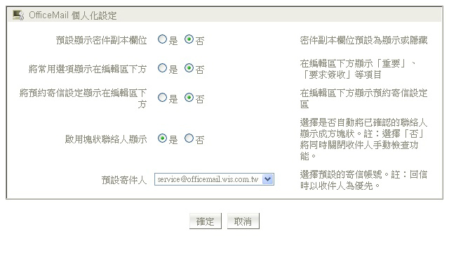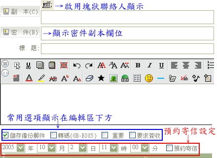 3. 按下「確定」後,即完成設定。下次編輯信件,您就可以發現「塊狀聯絡人顯示」、「密件」欄位直接呈現。同時,編輯區下方也可以找到「重要」、「要求簽收」以及「預約寄信」等。