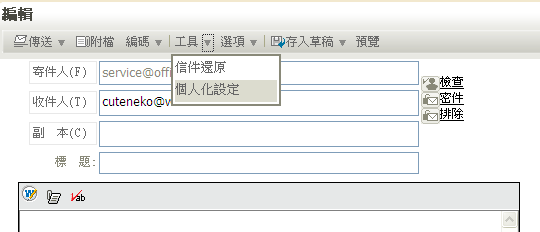 2 . 提供編輯區的個人化設定,共有五個選項。讓您可將常用的功能與欄位直接顯示於信件編輯區。