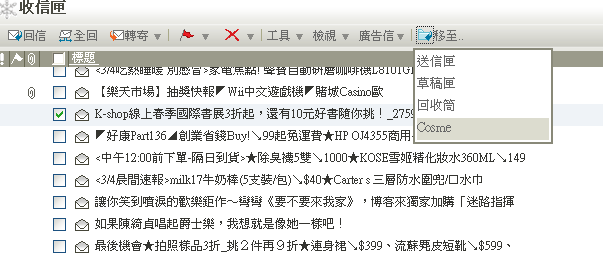 1. 在信件列表的頁面中,在需要搬移的信件標題前之空格內打勾。
