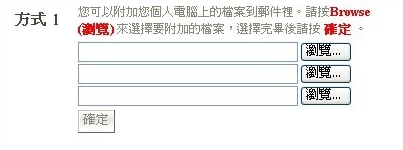 | 2. 填入欲附加的檔案位置及名稱(如C:\My Documents\abc.doc)或按下「瀏覽」按鈕選擇所需要的檔案,按「開啟」後,再點選「確定」。 |