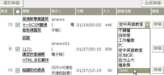 | 2.「歸檔信匣」的種類,以使用者自行設定的信件匣為主。有關信件匣的設定,請參考「建立新信匣」。 |